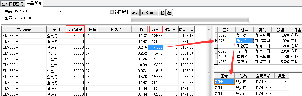 | ◆也许员工只关心自己做了多少,但是老板更关心这个货做了多少,还有多少没完成,灵灵兔都会让老板清清楚楚,如果超数量,还会红色报 警。而且还会追踪某道工序是哪些人做的,几月几号做的,以防日后查到次品,可以找到责任人: |