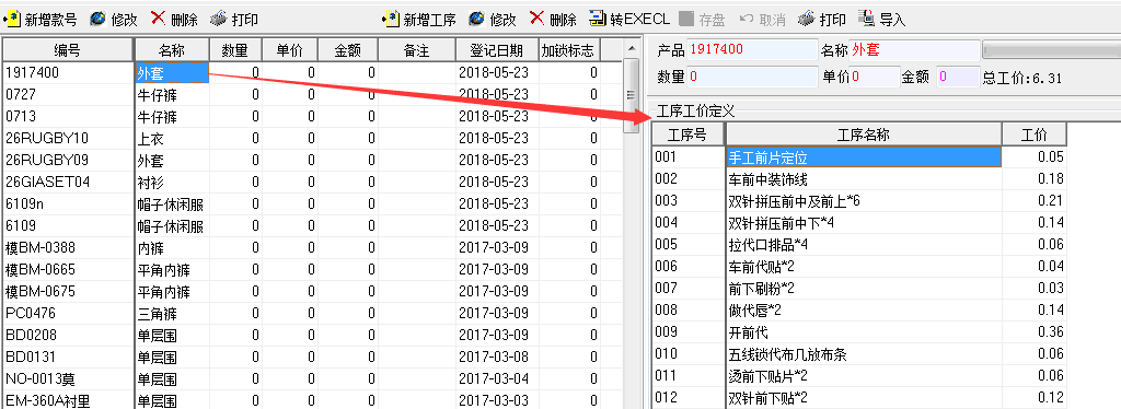 | ◆每款产品都有自己对应的工序工价,这个是计件工资的基础,一般由制定工序工价的部门操作决定: |