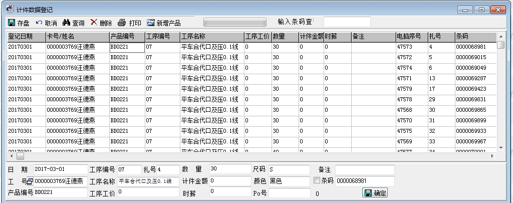 | ◆计件数据登记,就是统计员登记员工每天做了哪些产品哪些工序,工价可以先空着,事后再去核算,最后可刷新计件工资。如果是流水线生 产,则还可以使用条码工票系统。这个登记工作是傻瓜式的工作,不需要什么计算,因为计算那是灵灵兔的事,下图是单人计件登记: |