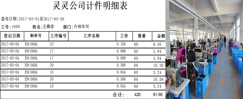| ◆员工想看自己每天的计件工资明细,很简单,灵灵兔已经给你准备好了,每天做了什么,做了多少,拿到多少钱,一目了然: |